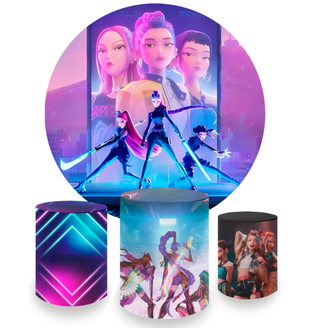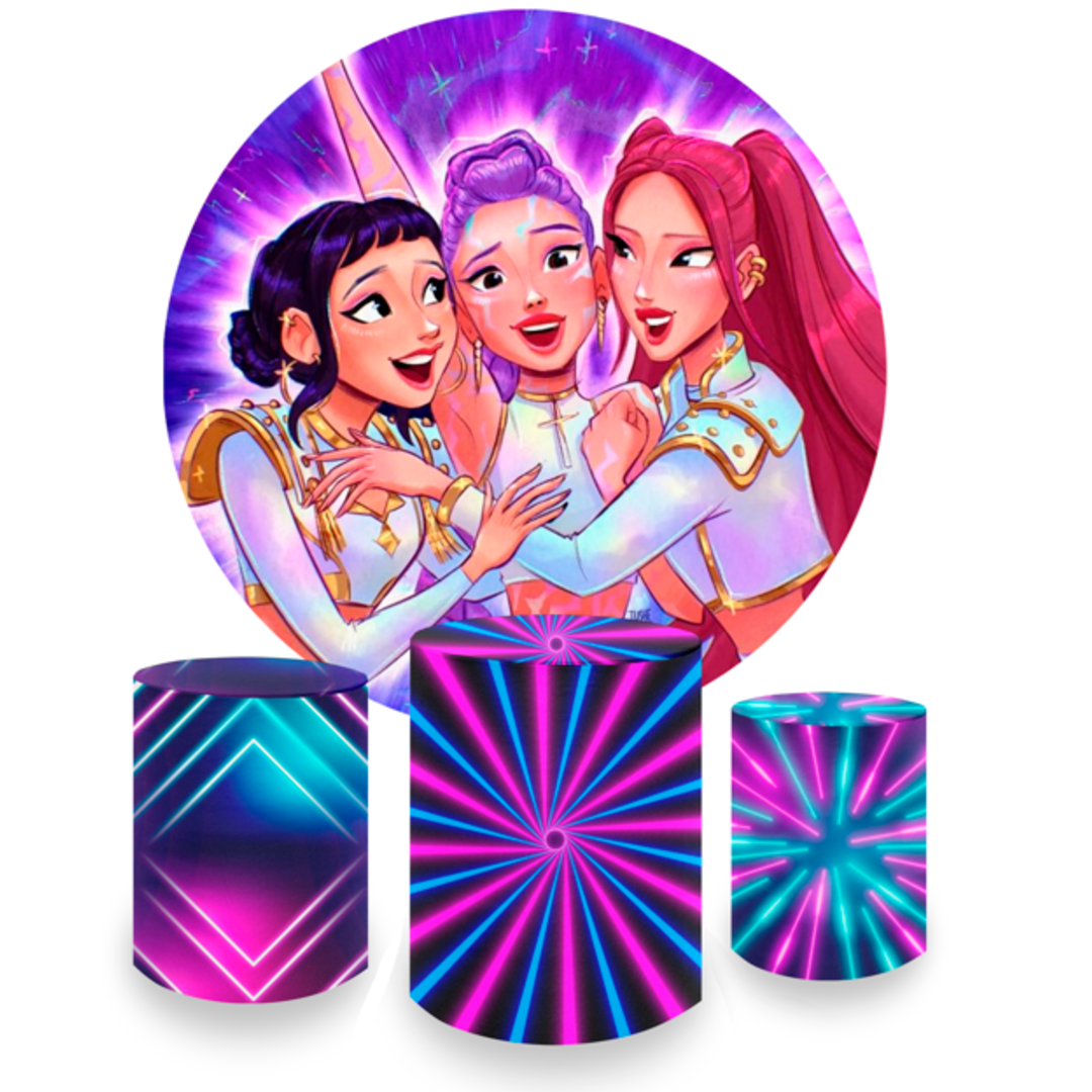 Kit Decoração Guerreiras do K-pop Painel Redondo + 3 Capas Cilindros Neon
