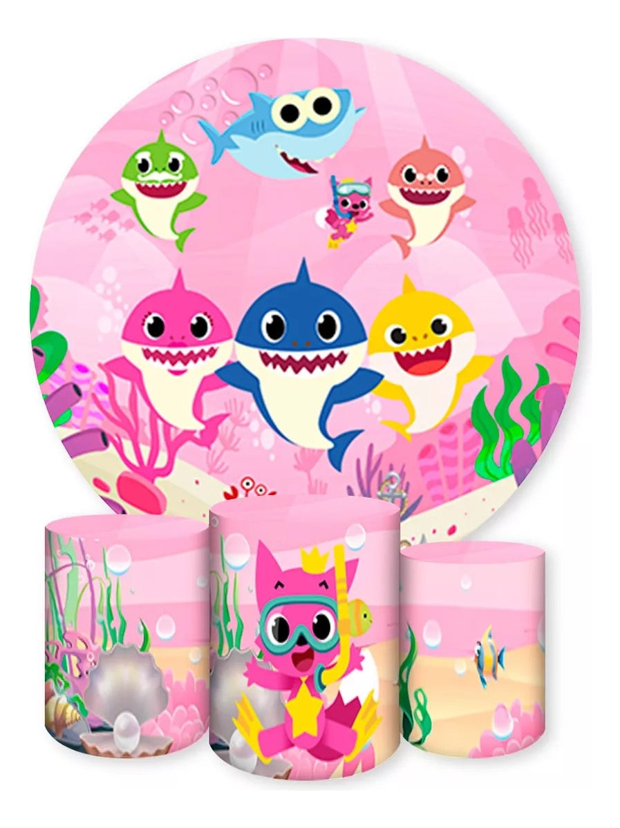 Painel Redondo Trio Cilindros Capas Baby Shark Tubarão 002 - Rosa